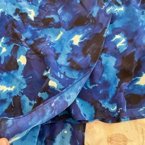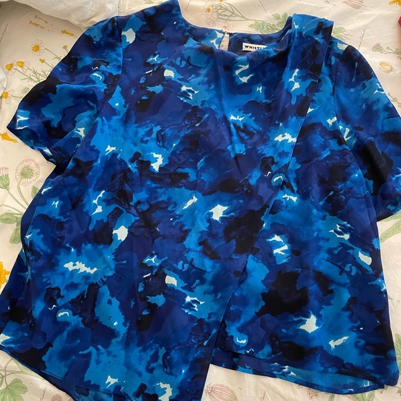 So gorgeous. Many shades of blue on floaty silk. This is a basic crew shape with a diagonal front and back overlay. Button and loop closure at back neck. Beautiful condition