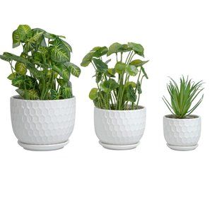 Each modern planter contains a drainage hole allows water to pass through the soil keeping your plants and flowers stylish and healthy. Attached saucer prevents leakage onto desk and tabletop surfaces. Nesting design allows planters to be easily stored inside each other when not in use. 3 flower pot set design is ok for both indoor and outdoor spaces. Can be used as a set or individually. Their clean-cut minimalist style texture are sure to add a soft touch to a variety of decors. *Plants in the picture are NOT included.