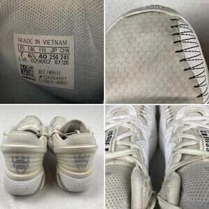These are a pair of white Donovan Mitchell Issue shoes. They have some staining and wear as pictured.