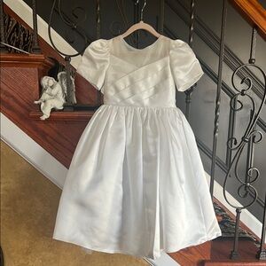 This exquisite white dress features a classic A-line silhouette, enhanced by whimsical puff sleeves and a sophisticated crew neckline. Ideal for a flower girl or wedding guest, its formal design radiates elegance and charm, perfect for a memorable occasion.