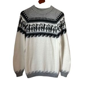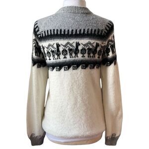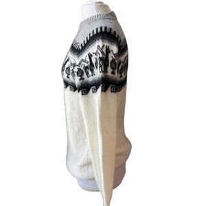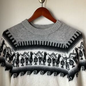 Adorable alpaca fair isle pullover sweater. Black and grey detail and alpacas at chest!! So pretty. There are no tags at all in this It fits like a medium, and is so soft, i can only assume it is alpaca wool. Not itchy at all. Flat lay 29.5” L, 18” P-P. Cozy
