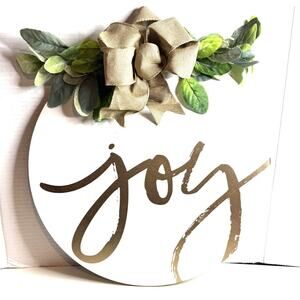 White And Gold Joy Holiday Sign Floral Bow Wooden Door Hanger Christmas Decor