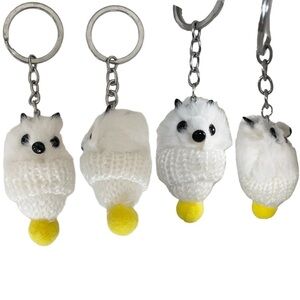 White Animal Keychain with Yellow Pom Pom in Mini Knitted Hat. New without tag. (Appears to have extra material on one side of nose.) Adorable animal keychain. White fur with yellow accents. About 4.5” inches in length. Perfect for bags or keys. See all photos.