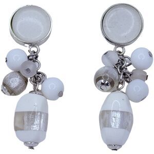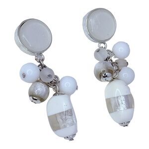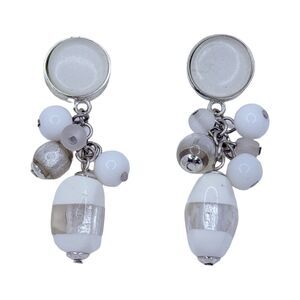 White Art Glass Beaded Cluster Dangle Drop Earrings 2" Silver Tone Trendy