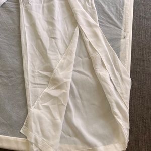 White pants with very high slit up the front of each leg, zipper in back, Gives a peek-a-boo effect when you walk as your leg pops out of the front, not to revealing.