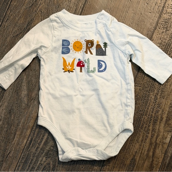 Adorable white baby onesie featuring a playful 'Born Wild' design with colorful letters and cute animal graphics.