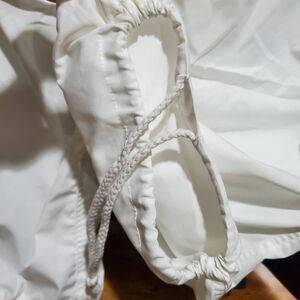 Baggy Cargo Pants By Edikted ... Raver Skater Pants.... Long Wide Leg with DrawString Cuffs... They are a pure white and easy to clean nylon type material... Size M/L, NWT... 17" across waist/hips and then they get baggier around the hips and legs, extra baggy knees... The pockets are buttoned and an extra button is included, and there is a string tie around the waist / hips as well... inseam is 29"