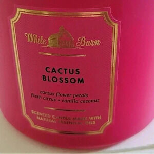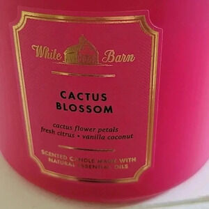 White Barn 14.5oz 3 Wick Candle in a Fuchsia Container NWT 14.5 oz Cactus Bloom=cactus flowering petals, sparkling citrus, and warm vanilla coconut. Very pleasant scent!!