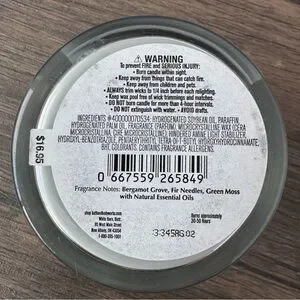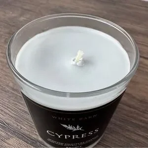 White Barn Cypress scented candle. Clean black label with gold accents. Glass jar with black lid. Fresh, botanical style.