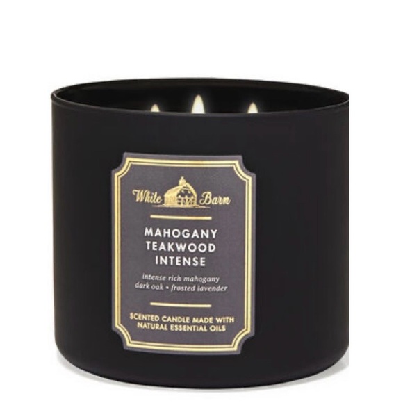 Mahogany Teakwood Intense 3-wick candle from Bath & Body Works - White Barn in black with a gold lid. Fragrance notes include intense rich mahogany, dark oak and frosted lavender. Made with natural essential oils.