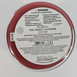 Infuse your space with sunny vibes using this 14.5 oz White Barn "The Perfect Summer" candle, featuring a vibrant red wax and decorative jar with a stylish, summery landscape design. This limited edition three-wick candle delivers a blend of sun-kissed citrus, orange blossoms, and coconut husk, crafted with natural essential oils for a bright, refreshing aroma. High concentrations of fragrance oils ensure impressive scent throw, while a premium soy wax blend and lead-free wicks provide a clean, even burn. Approximate burn time is 2545 hours. The candle is brand new, unused, and comes with its original White Barn embossed lid. Collectible summer décorperfect for gifting or enjoying at home.