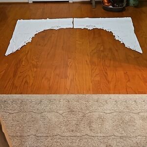 White Battenburg Lace Waterfall Curtain Drapes 100% cotton, approx 62" laying flat, Cottagecore. Excellent pre loved condition, measurements in pics, smoke free home, ships next day. Bundle and Save!