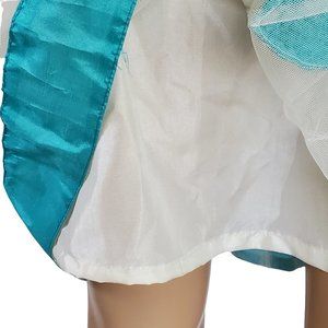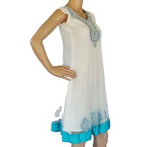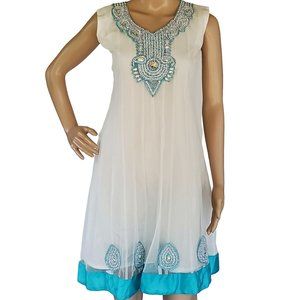 White Beaded A Line Sun Dress Women's XS Sleeveless Teal Trim Lined Netted
