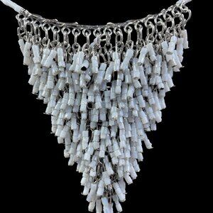 This white beaded fringe necklace is a show-stopping accessory designed to turn heads. Made with cascading seed beads arranged in a dramatic triangular drop, the necklace flows beautifully with movement. The beads are linked to a silver-tone chain, giving the piece both structure and elegance.