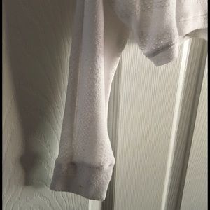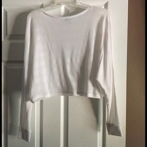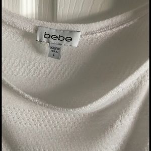 White Bebe long sleeve top, size L . Small spot on sleeve (as pictured) may wash out.