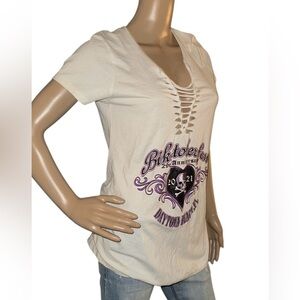 Make a bold statement in this edgy Biketoberfest tee featuring a unique lace-up neckline and graphic skull print. Perfect for rally lovers and biker event collectors.
