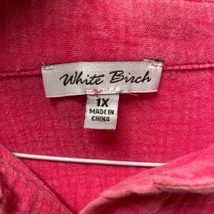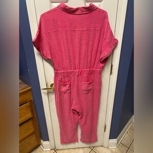 White Birch 1X pink texture, short sleeve pocket buttons jumpsuit