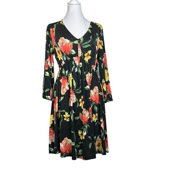 White Birch Dress Womens Size S Black Floral Silky Stretchy Feminine Colorful