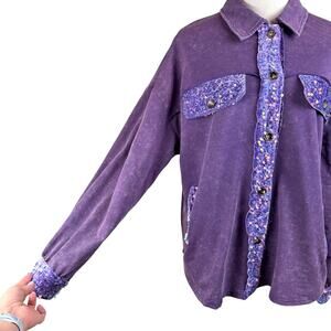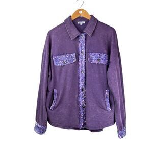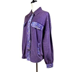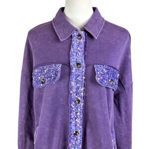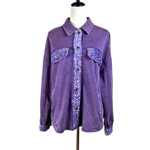 White Birch Purple Mineral Wash Velvet Trim Sequis Button Up Relaxed Shacket