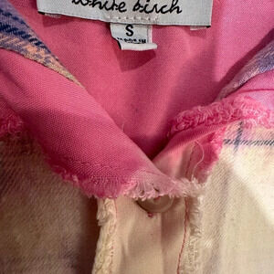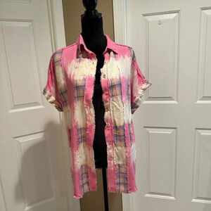 - Description: pink bleached woven plaid button down. Shirt. Short sleeve with distressed seems. Made with 100% cotton . Open front for a relaxed fit. Boho chic style.