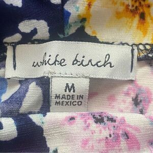 White Birch Blue/Floral Design Body Suit Size Medium. Excellent pre-owned condition. Turtleneck body suit with long sleeves. Lightweight. Polyester/spandex blend. Hand wash. Style T1009A1XL. Measures approximately chest 34", length 27", sleeve 24.5".