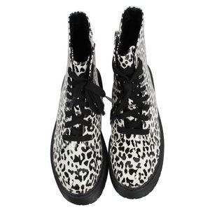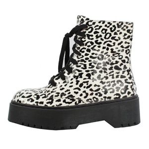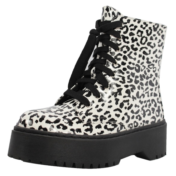 White black print faux leather patent lace up with inner side zipper for easy on/off. Platform 1 1/2" to 2". Model is a size 7 and a size 7 fits her perfectly with room for socks. This style is true to size. This style only comes in whole sizes. If you are half size, I would go with the bigger size since you can wear with socks.