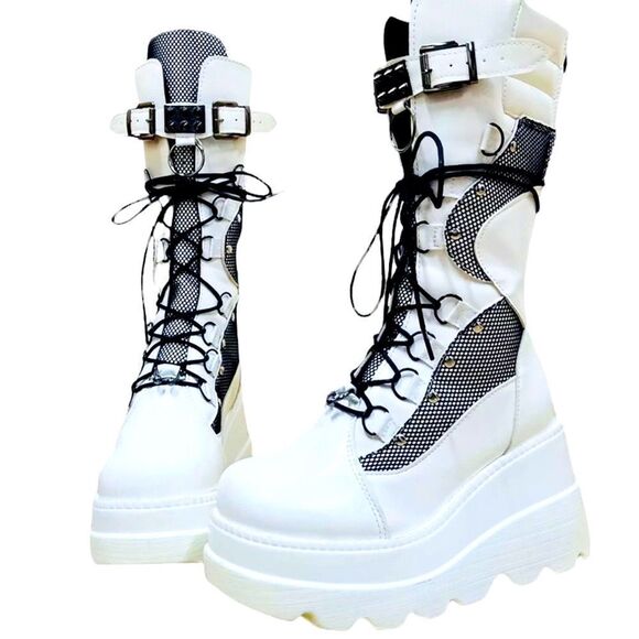 Alternative fashion footwear! A tall platform combat boot! Easy access with back shaft zipper and lace up front! White with black mesh net accenting, and elevate your attire with wedge platform. D-Rings lace up, double buckle detailed with spiked plate, rivets for stompin style boots! Tall calf boots!