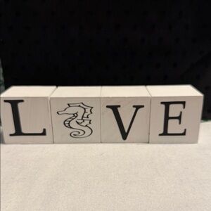 Charming white block decor spelling 'LOVE' with a design. Perfect for adding a touch of whimsy to any space. Set of white decorative blocks spelling 'HOME' with a turtle design. Perfect for home decor. Each side of block has different letters and design - HOME-LUCK-LOVE-HOPE - Designs are Lobster- Flamingo- Crab and Seahorse