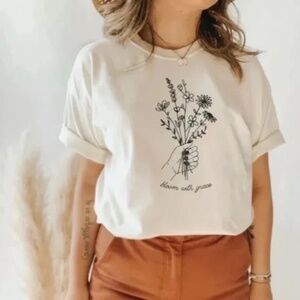 White "Bloom With Grace" graphic screen printed t-shirt. Unisex oversized relaxed fit.