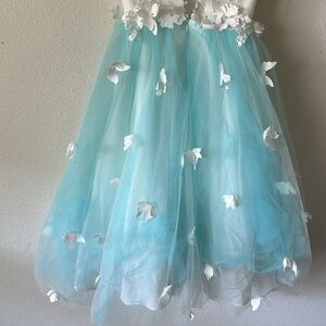 Elegant dress with white floral lace and blue tulle skirt. Charming white and blue dress with floral accents. The butterflies on base are folded over and I don't know what you could do to make them stand up. Please look carefully as dress is sold Asis. Perfect for special occasions.