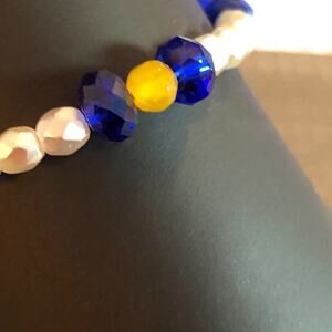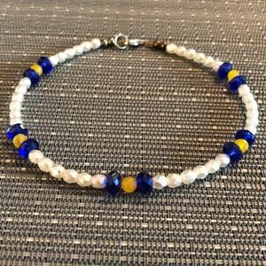 NEW - White, Blue and Yellow Handmade Ankle Bracelet with Pearlized White Diamond Cut Seed Beads, Royal Blue Swarovski Beads, Yellow Diamond-Cut Jade Beads, Round Silver Accent Beads and a Silver Lobster Clasp.