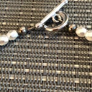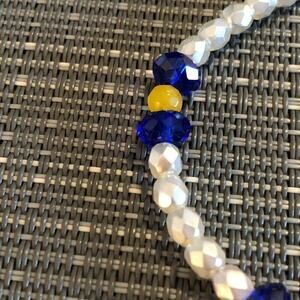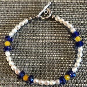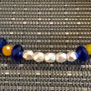 NEW - White, Blue and Yellow Handmade Bracelet with Pearlized White Diamond Cut Seed Beads, Royal Blue Swarovski Beads, Yellow Diamond-Cut Jade Beads, Round Silver Accent Beads and a Silver Toggle Clasp.
