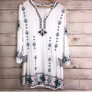 Beautiful white cotton dress with colorful embroidery. New With Tags. 22 inches from armpit to armpit and fabric is 55% cotton 45% rayon