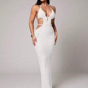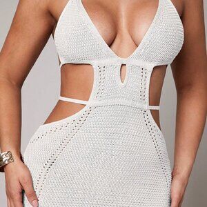 White Boho Crochet Deep V-Neck Hollow Slit Mid-Length Women's Cover Up Dress