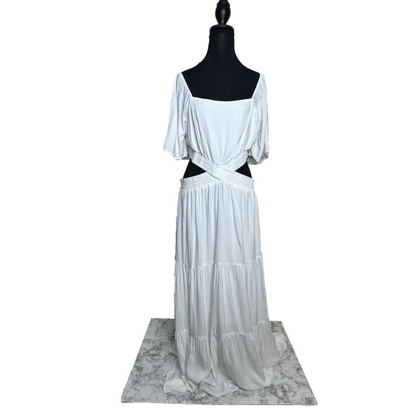White Boho Maxi Dress XL Flutter Sleeve Pockets Cutout Waist Tiered Cottagecore