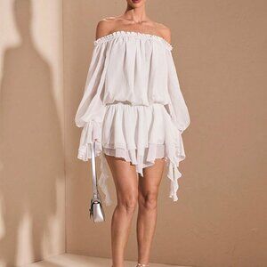White Boho Women's Elegant French Style Off-Shoulder Long Sleeve Shirt Dress