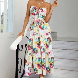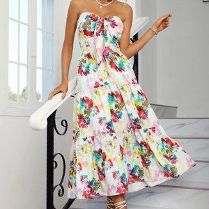 White Boho Womens Floral Print Knot Front Shirred Ruffle Hem Tube Dress