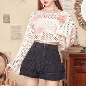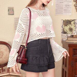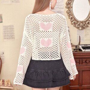 White Boho Womens Heart Pattern Drop Shoulder Open Knit Sweater
