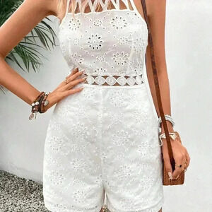 White Boho Women's Hollow Out Embroidered Waist Cinched Sleeveless Jumpsuit