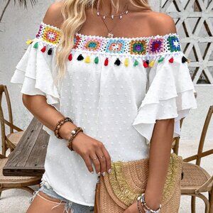 White Boho Women's Off Shoulder Shirt With Colorful Tassel Design