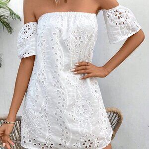 White Boho Women's Open Shoulder Dress with Embroidered Pattern
