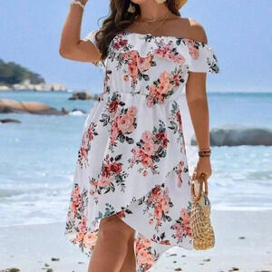 White Boho Women's Plus Size Floral Print Off Shoulder Wrap Hem Dress