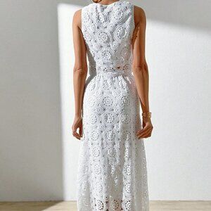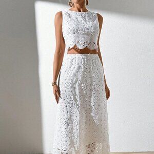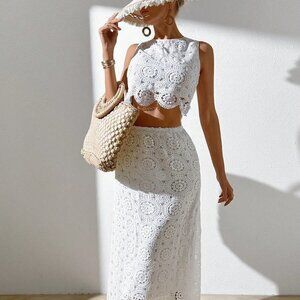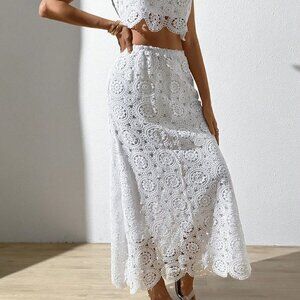 White Boho Womens Solid Color Elegant Lace Two-Piece Set