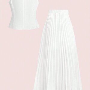 White Boho Women's Summer Elegant Collared Vest With Pleated Skirt