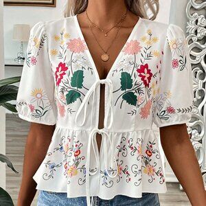White Boho Women's Summer Printed V-Neck Tie-Front Short-Sleeve Cardigan Shirt