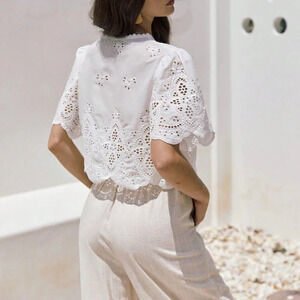 White Boho Women's Summer Ruffle Sleeve Embroidery Fabric Lace Up Short Top