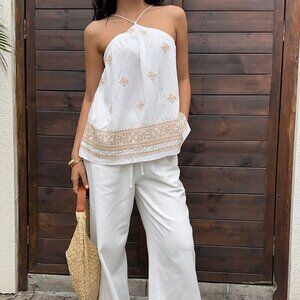 White Boho Women's Vacation Casual Geometric Embroidered Backless Halter Top