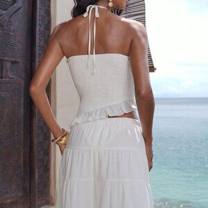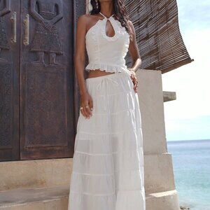 White Boho Women's Woven Neck-Tie Ruffled Trim Tank Top
