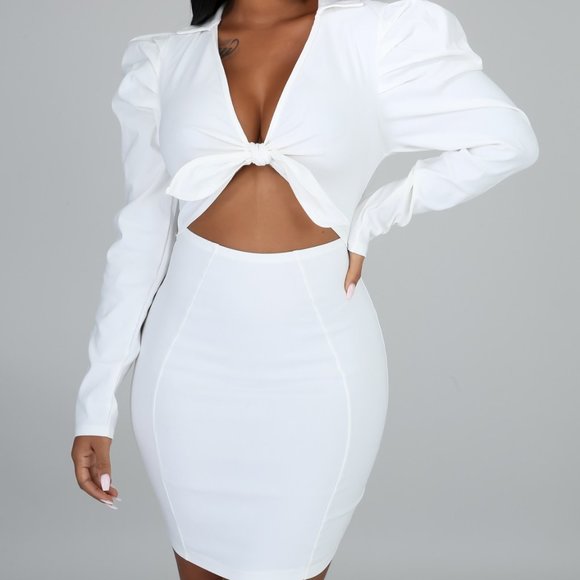 Fashion Element: Puffed sleeves, Cut out mid section, Bow Tie detail