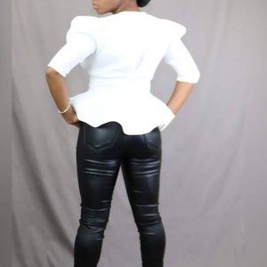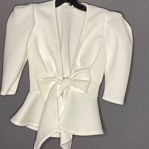 White blazer style top. It ties in the front. Flare stlye. Dress it up or down. This top embodies whatever is your lifestyle.